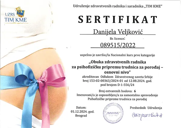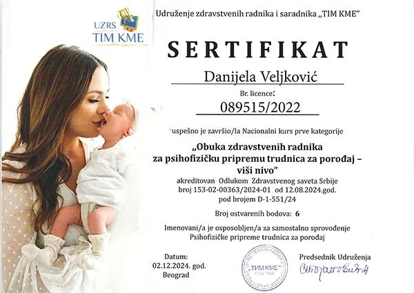 Danijela je master menadžer zdravstvene zaštite, diplomirana medicinska sestra i sertifikovani edukator Svetske zdravstvene organizacije (WHO) za prakse podrške dojenju – kako za zdravstvene radnike, tako i za roditelje. Pored toga, ona je i zvanični predstavnik Republike Srbije u međunarodnim programima za promociju dojenja i razvojnu negu novorođenčeta.